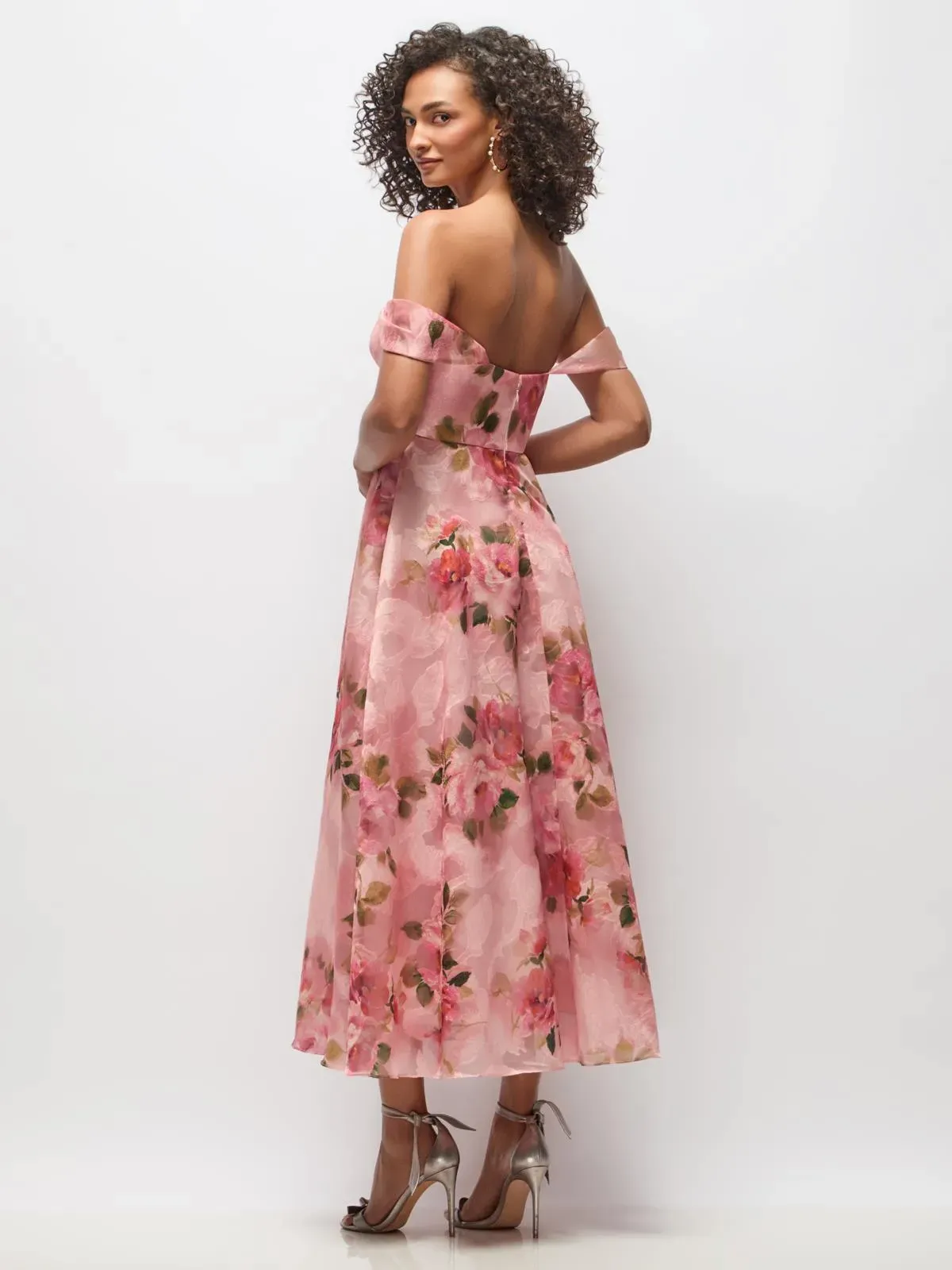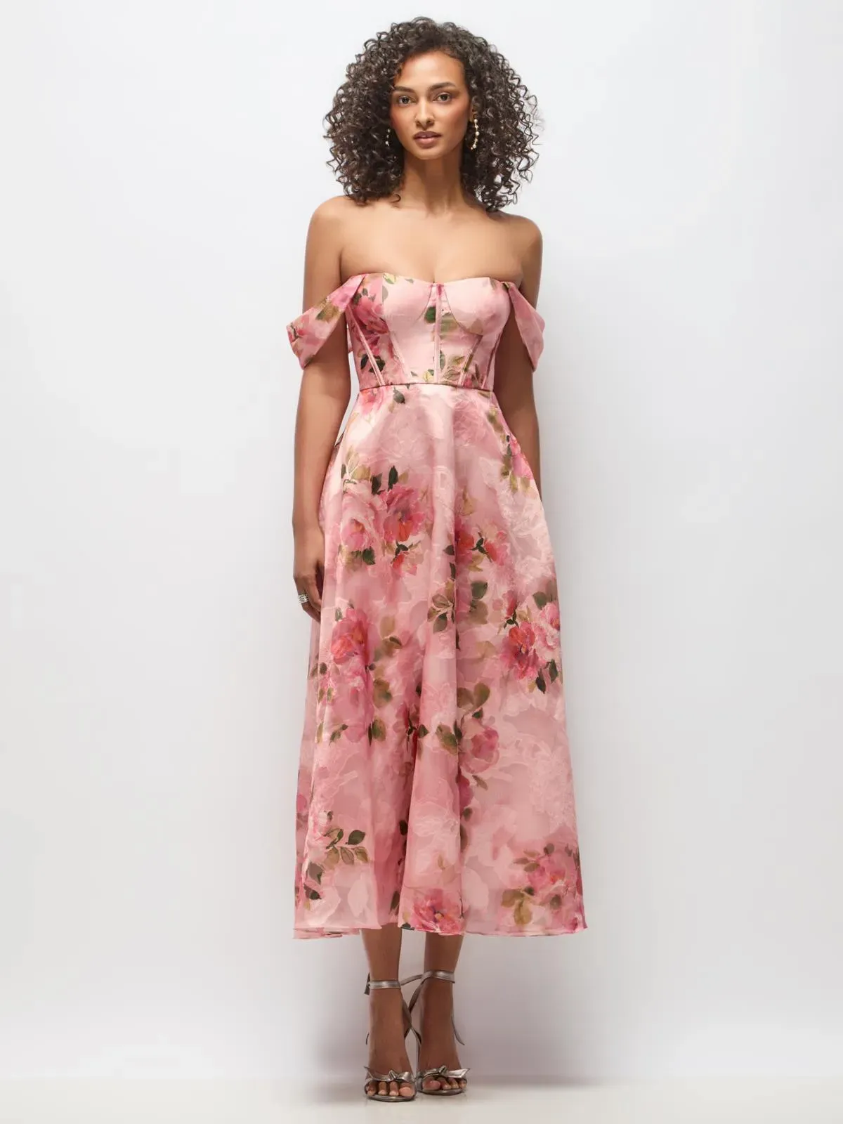 Tea length strapless Guava Floral Organza Jacquard dress with boned bustier bodice and off-shoulder soft swags. Circle skirt.