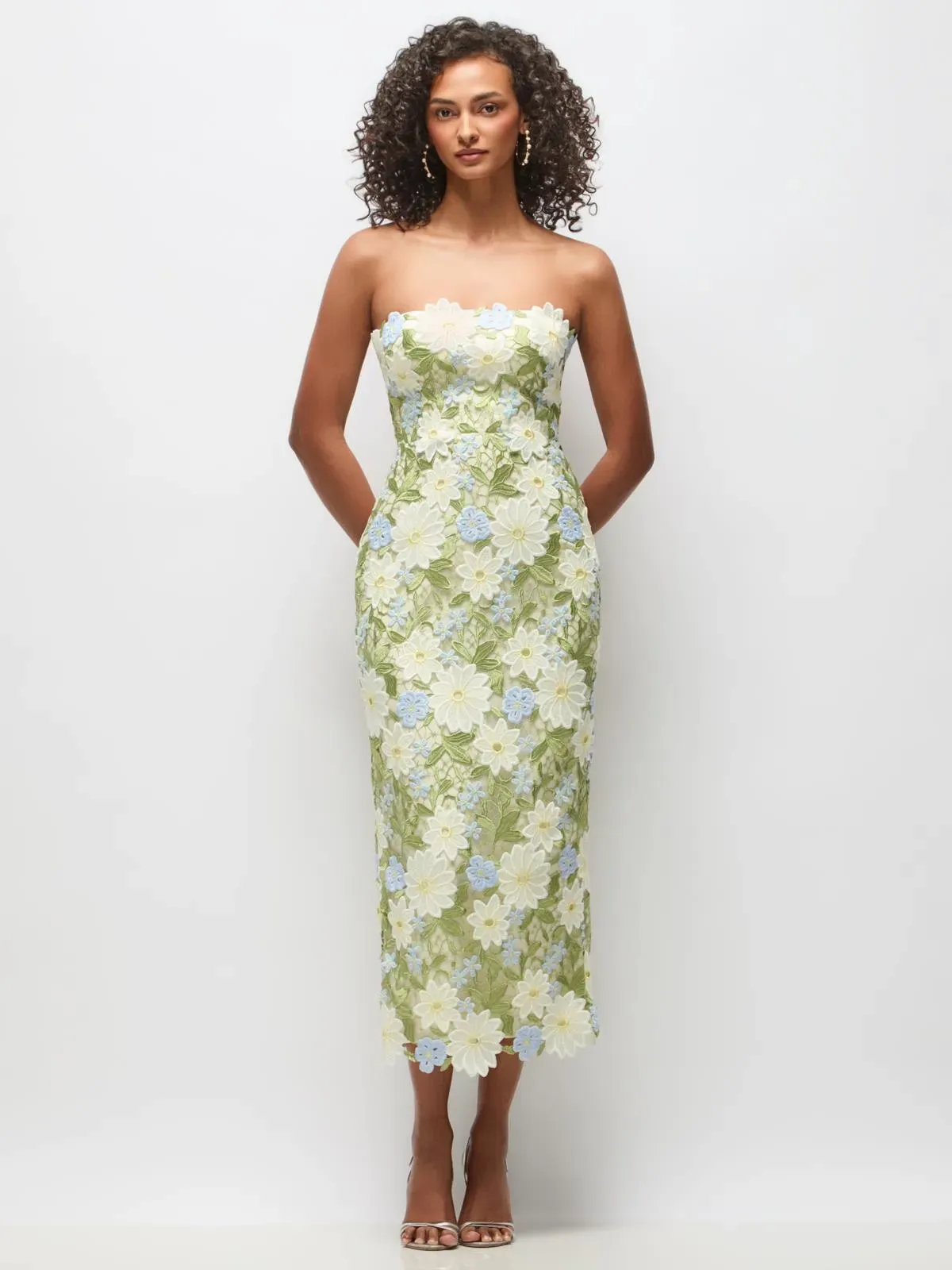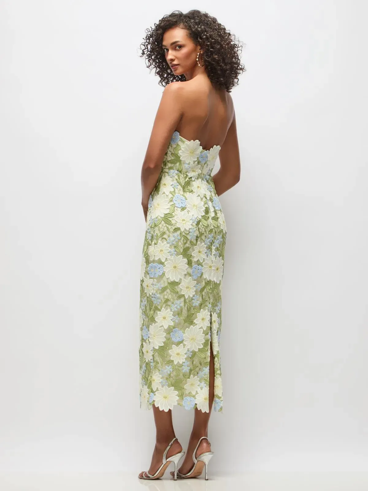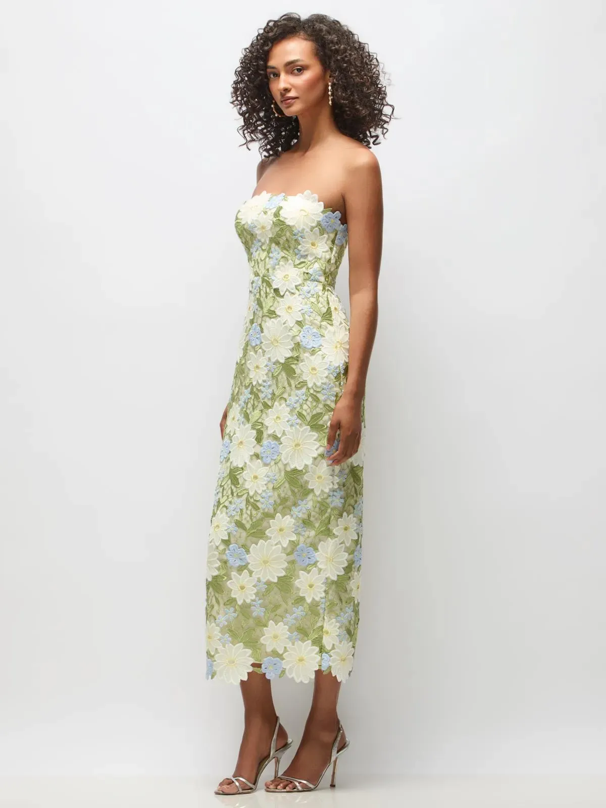 Tea length strapless Daisy Multi Lace dress with column skirt and motif edge detail at neckline and hem.