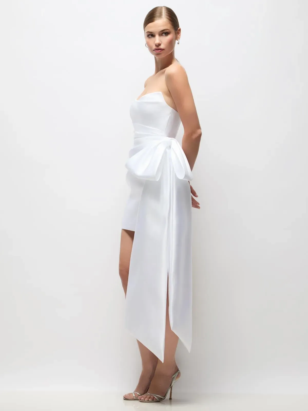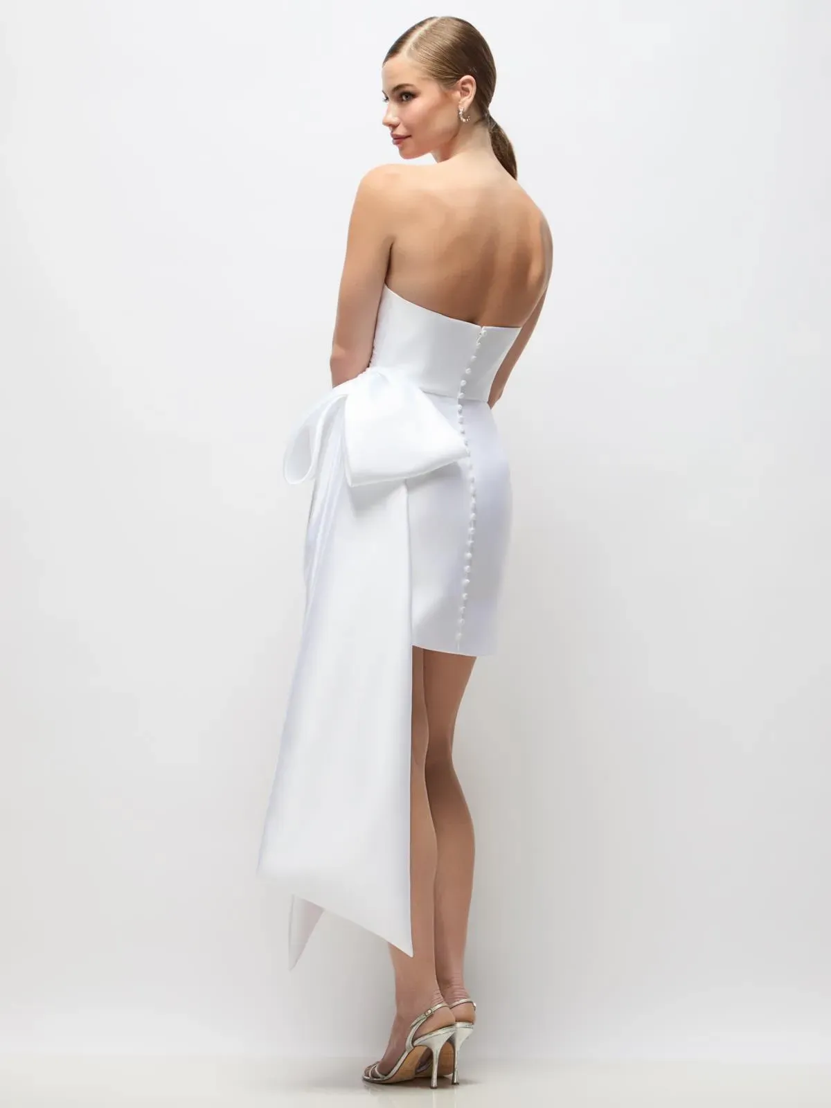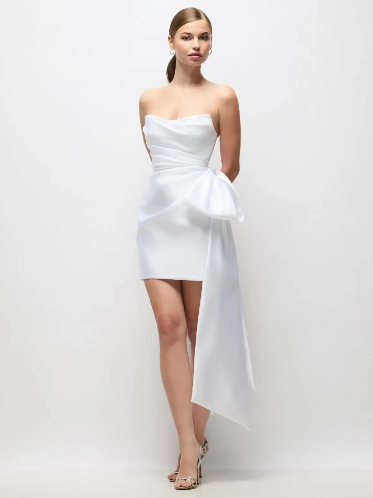 Strapless satin twill mini dress with pleated draped bodice and skirt. Dramatic bow with long tails at hip. Covered button detail at back seam.