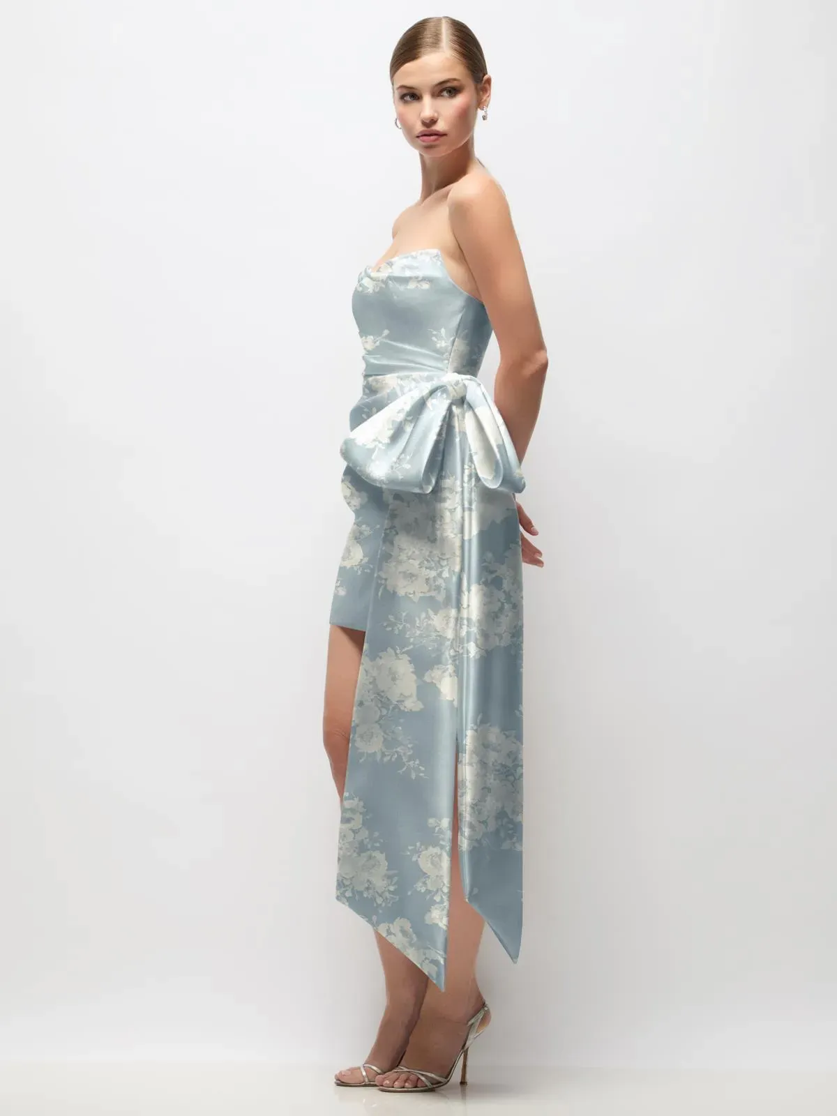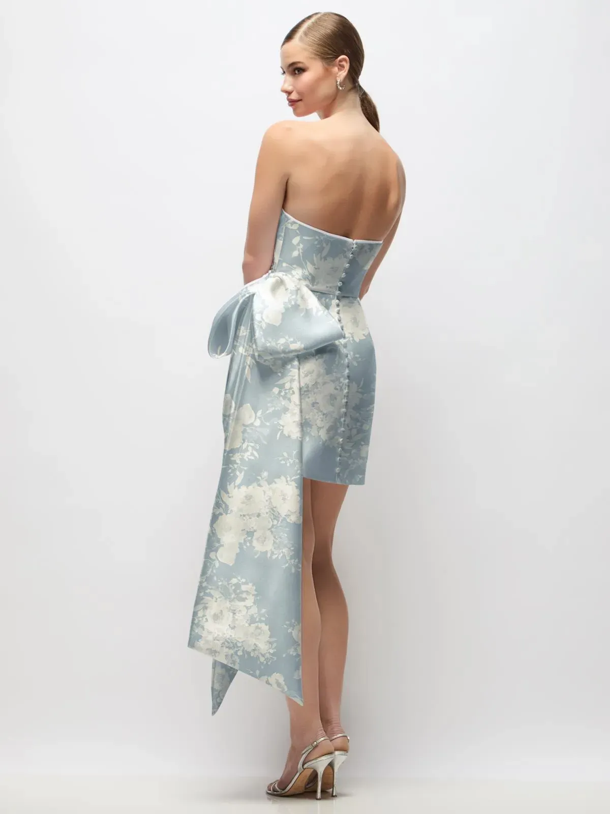 Strapless floral satin twill mini dress with pleated draped bodice and skirt. Dramatic bow with long tails at hip. Covered button detail at back seam.